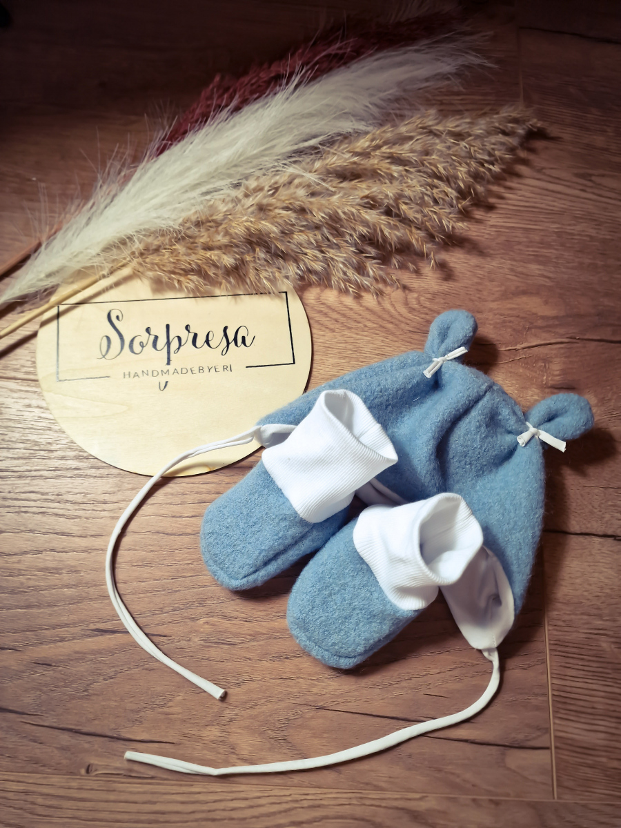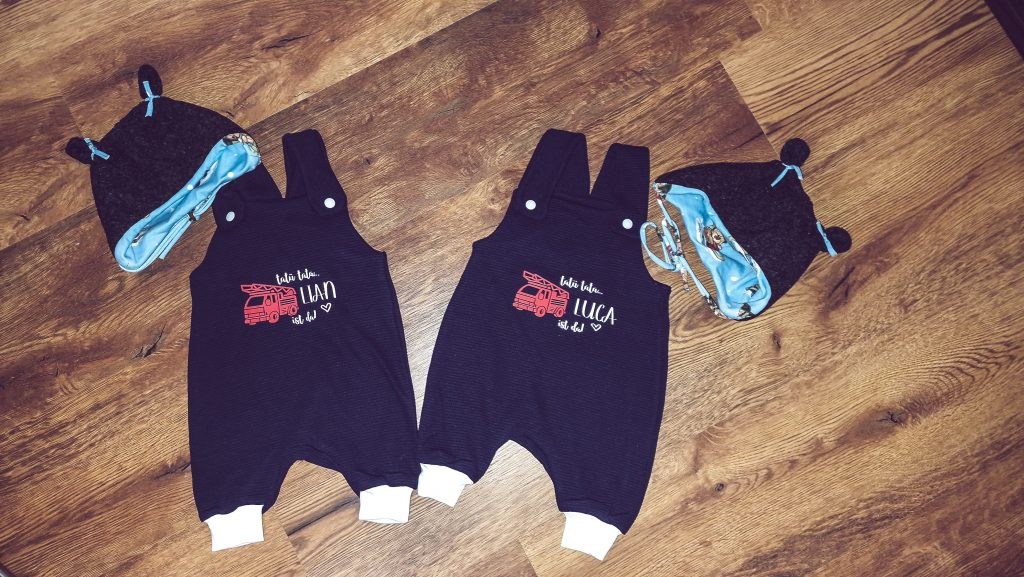 Die Schnittmuster-Hersteller sind Monstabella Öhrchen Mütze, Nealina Schühchen Kid5 Latzhose und Halstuch, Schleiferlwerk Funkyhead Mütze.