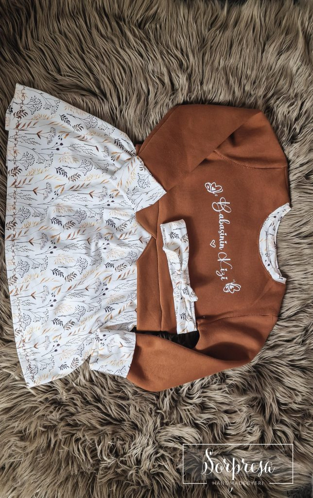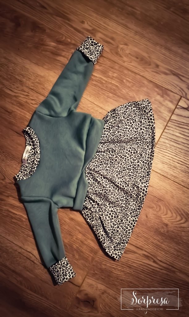 Das Oberteil des Sweaters besteht aus Sommersweat/French Terry/ Alpenfleece und das Schößchen aus Jersey.