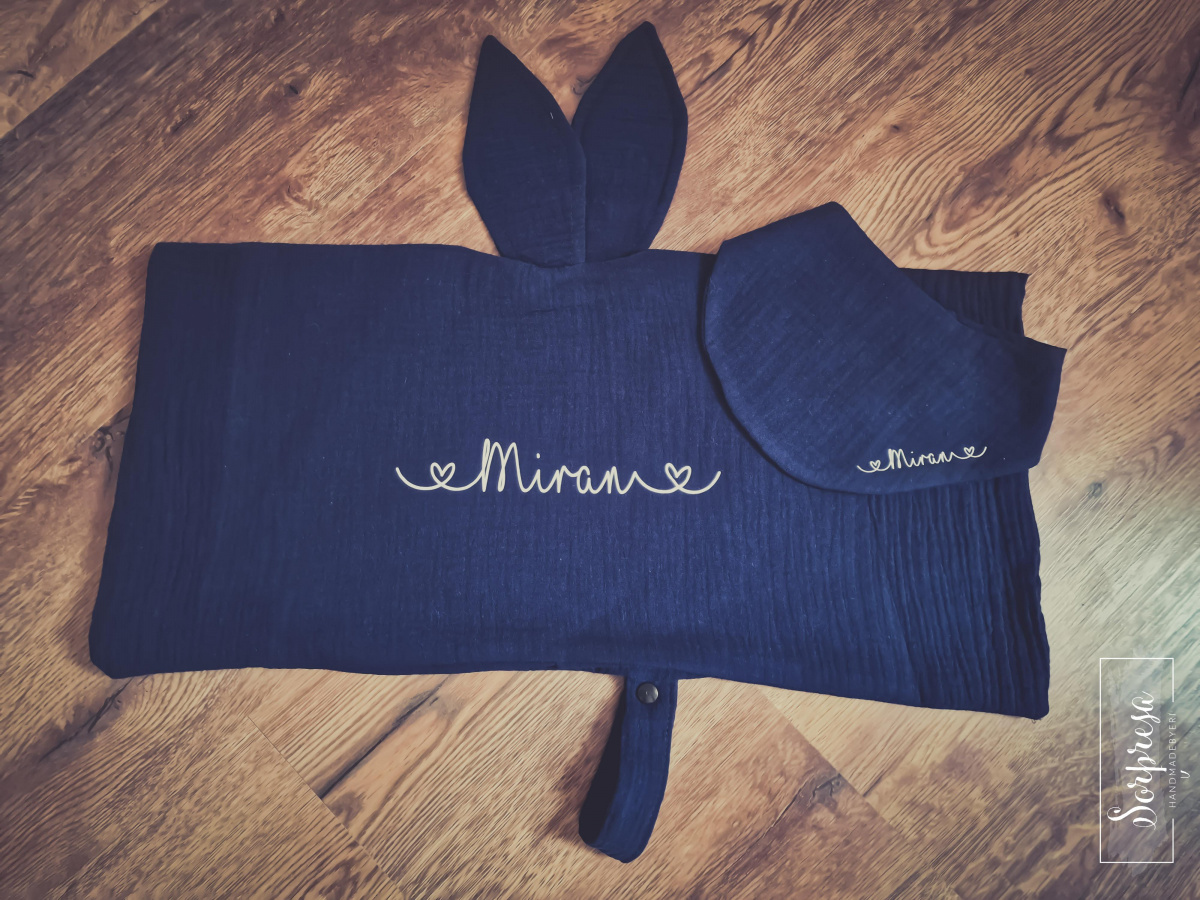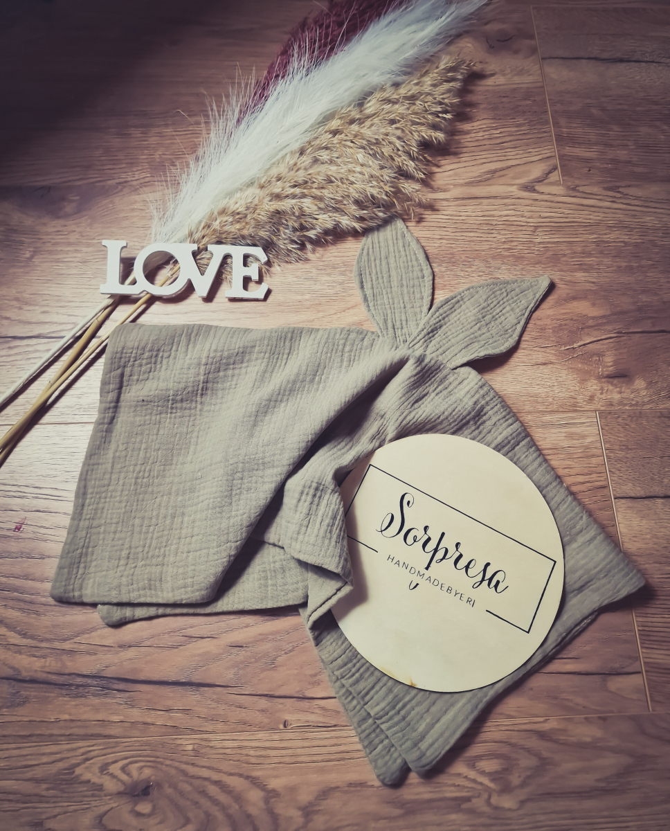 Das Schmusetuch gibt es in verschiedenen Farben und wenn gewünscht personalisiert mit dem Namen des Kindes oder einem Wunschtext. Der Musselinstoff ist doppellagig. Öhrchen können auch weg gelassen werden, falls gewünscht.